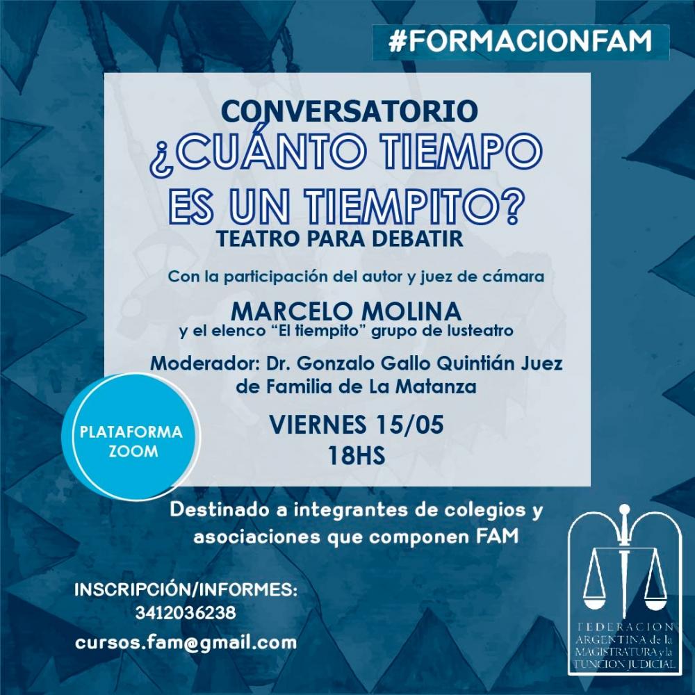 En su Ciclo de Videoconferencias que proponen herramientas para la acción judicial en el marco de la pandemia COVID-19, la FAM suma un espacio para reflexionar sobre los sistemas de justicia y el abordaje de situaciones de vulnerabilidad de los derechos de niñas, niños y adolescentes, violencia de género, salud mental e internaciones y ancianidad. Se trata de un Conversatorio cuyo disparador es una obra de Teatro denominada ¿Cuánto tiempo es un tiempito?”, escrita y dirigida por el juez de cámara y ex juez de familia rosarino Marcelo José Molina, que se desarrollará el próximo viernes 15 de mayo a las 18 hs a través de la Plataforma Zoom.