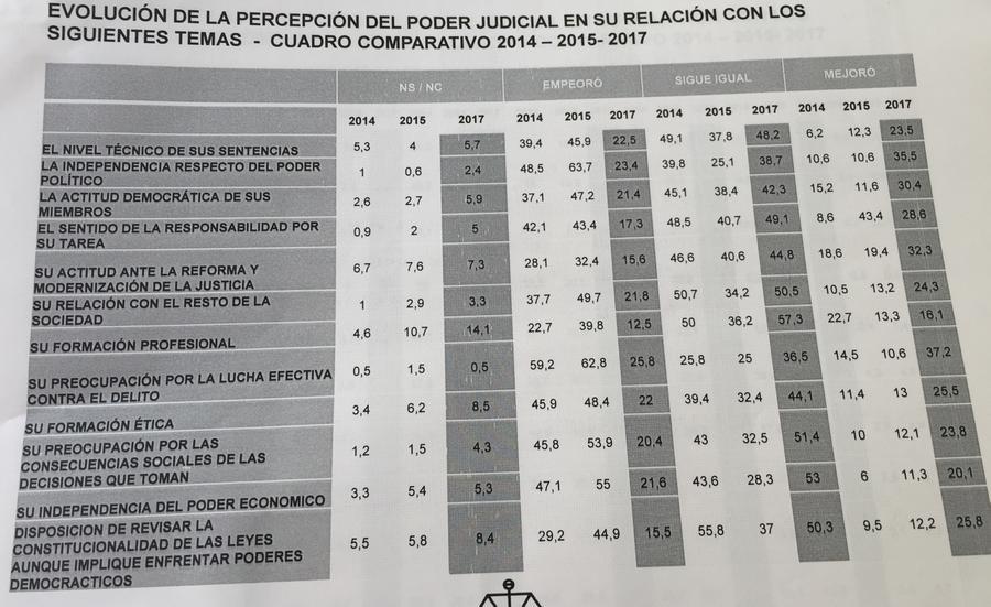 Asimismo, al analizar el nivel de confianza en el buen funcionamiento y la ecuanimidad de los jueces argentinos en general, en el 2007 un 73,6% tenía un nivel de confianza categorizado como “mucho + algo”, que bajó a un 46,4% en 2016, y subió a un 60,4% en el 2017. Por otra parte, entre los que la confianza oscila entre “poco + nada”, fue subiendo de un 23,8 en el 2007, pasando por un pico de 53.3 en el 2016 y estabilizándose en un 39,6 en el 2017.