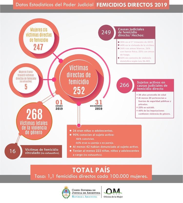 “Se identificaron 252 víctimas directas de femicidio en nuestro país, desde el 1 de enero al 31 de diciembre de 2019. Esta cifra incluye 5 travesticidios/transfemicidios. También se identificaron 16 víctimas de femicidio vinculado (como se denomina a los homicidios cometidos como modo de causar sufrimiento a una mujer que no es ella misma la víctima material). Al sumar ambas categorías, la cifra de víctimas letales de la violencia de género en Argentina durante 2019 ascendió a 268” indicó la vicepresidenta de la Corte. En todo el país, 222 niñas, niños y adolescentes quedaron en situación de orfandad como consecuencia de los femicidios.