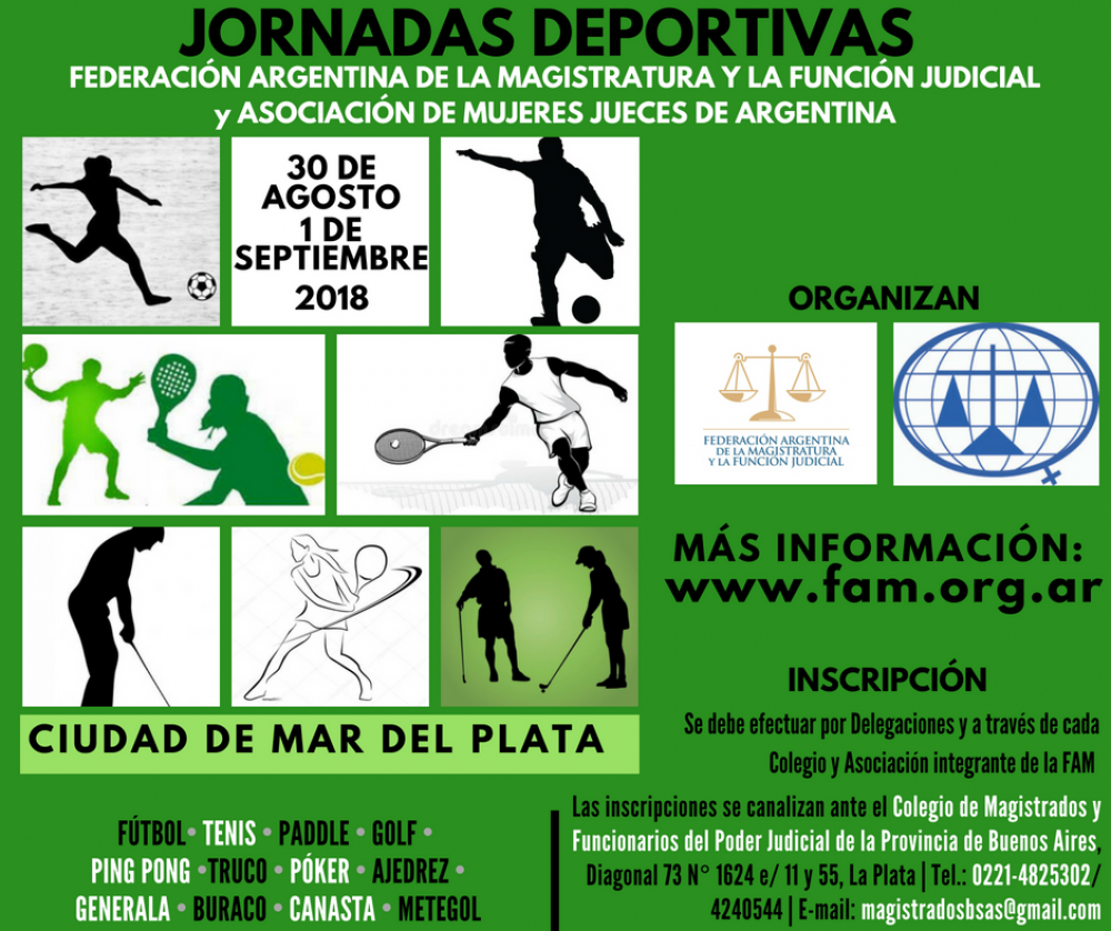 Las Jornadas Deportivas son co-organizadas con la Asociación de Mujeres Jueces de Argentina, este año se desarrollarán del 30 de agosto al 1 de septiembre en la ciudad de Mar del Plata. Las inscripciones se efectúan por Delegaciones y a través de cada Colegio y Asociación integrante de la FAM, quienes a su vez registrarán sus equipos y participantes en el Colegio de Magistrados y Funcionarios del Poder Judicial de la provincia de Buenos Aires, Diagonal 73 N° 1624 e/11 y 55, La Plata, teléfonos (0221) 4825302/4240544, correo: magistradosbsas@gmail.com