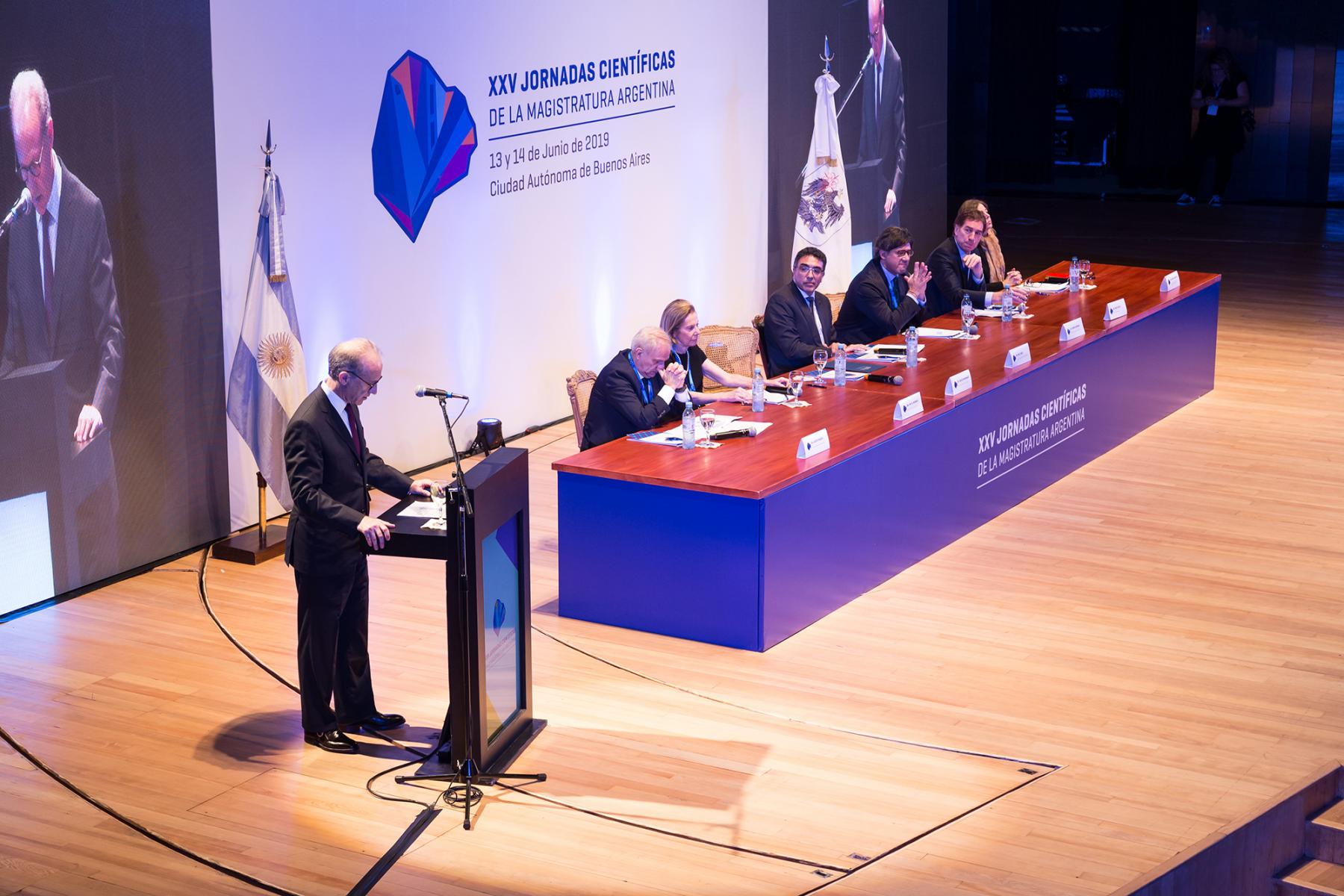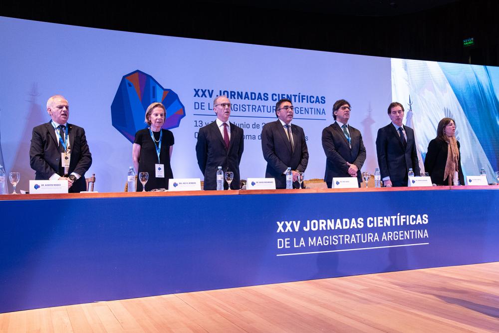 El presidente de la Federación Argentina de la Magistratura y la Función Judicial (FAM), Ariel Ariza, inauguró las XXV Jornadas Científicas de la Magistratura Argentina acompañado por el presidente de la Corte Suprema, Carlos Rosenkrantz, el ministro de Justicia y Derechos Humanos de la Nación, Germán Garavano, el vicejefe de Gobierno porteño, Diego Santilli, la presidenta del Tribunal Superior de Justicia de la Ciudad Autónoma de Buenos Aires, Inés Weinberg, el presidente del Consejo de la Magistratura de CABA, Alberto Maques, y la presidenta del Colegio de Magistrados, integrantes del Ministerio Público y Funcionarios del Poder Judicial de CABA, Marcela María Paz.