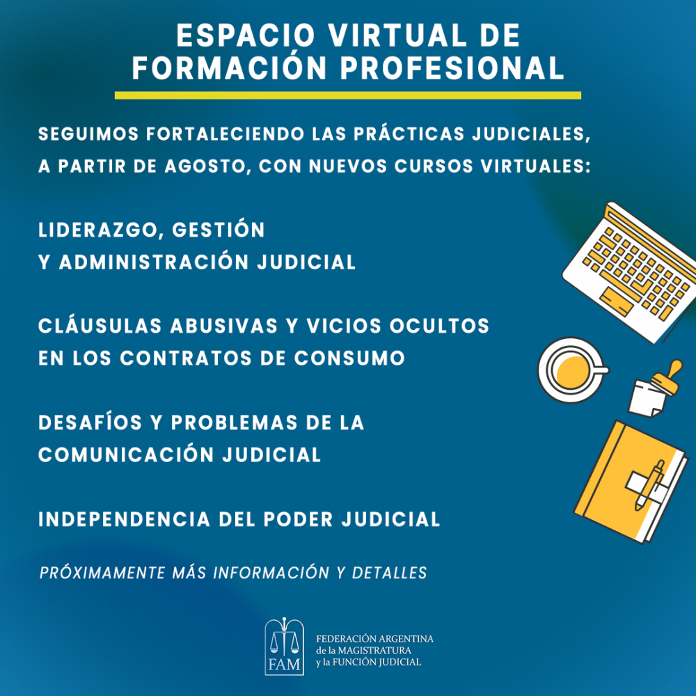 Se lanzan cuatro nuevos cursos virtuales desarrollados por la FAM junto a PENT FLACSO destinados a aquellas personas motivadas en volverse agentes de cambios y transformaciones, a partir de un aprendizaje dinámico, desde el ámbito judicial y para la construcción de una sociedad más justa.