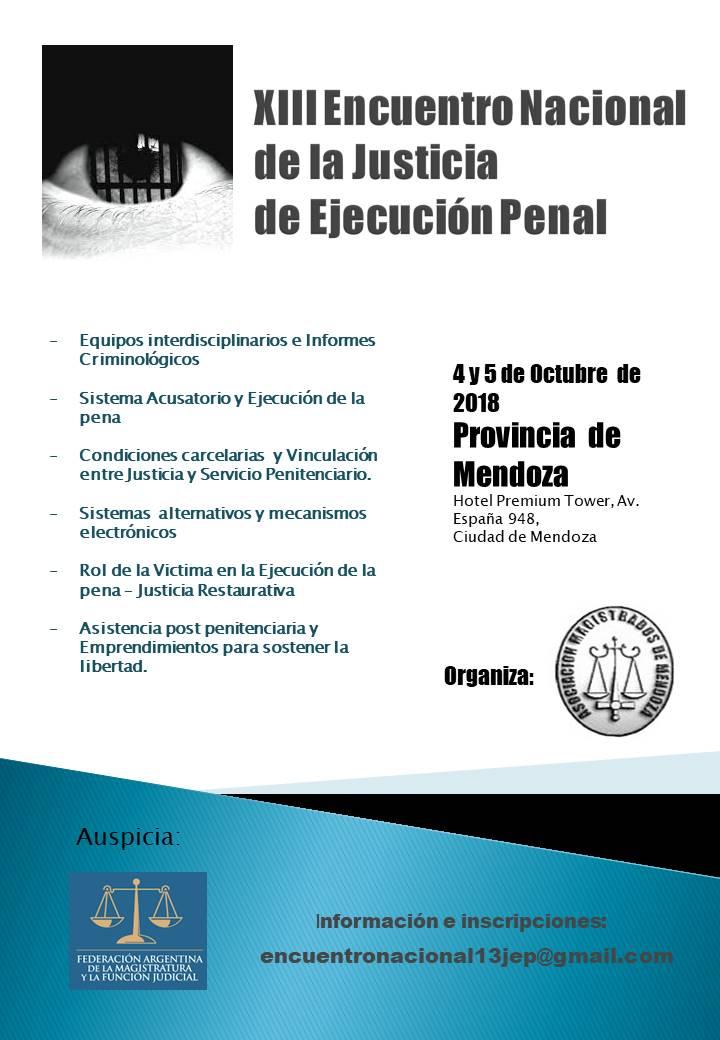 Este XIII Encuentro Nacional de la Justicia de Ejecución Penal es organizado por la Asociación de Magistrados de la Provincia de Mendoza y cuenta el auspicio de la Federación Argentina de la Magistratura y la Función Judicial, tendrá lugar los días 4 y 5 de Octubre de 2018, en el Hotel Premiun Tower, Av. España 948, 5500 Ciudad de Mendoza.